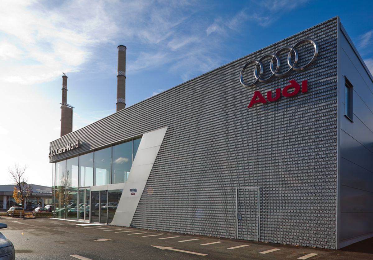 Společnost Audi AG koncipovala svým Audi terminálem pro své smluvní partnery novou architekturu značky – protože rostoucí počet nových modelů vyžaduje větší prezentační prostory. Po Sydney, Mnichově, Genfu a Postupimi vznikl v lokalitě Gera-Nord pro Autohaus AfA „Vše pro auto“ jeden z prvních terminálů v novém architektonickém provedení. Vnitřní prostor Audi terminálu přitom charakterizuje příkrá zakřivená stěna - s úhlem sklonu 60° a poloměrem 135 m slouží současně jako prostorové zakončení, stropní clona a parapet. Stejně rozmanité jsou v ní integrované produkty – od sádrokartonu přes speciální desky až po individuálně prefabrikované tvarové díly.